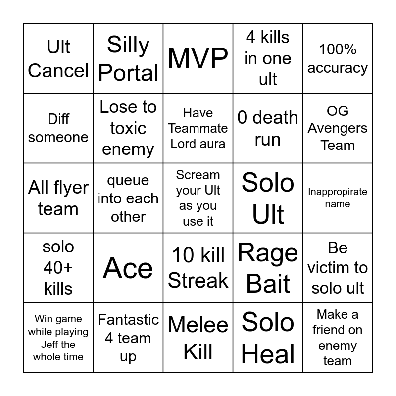 This bingo card has a free space and 24 words: Ace, Fantastic 4 team up, Have Teammate Lord aura, Win game while playing Jeff the whole time, 100% accuracy, Ult Cancel, Diff someone, Silly Portal, Solo Ult, 10 kill Streak, 0 death run, All flyer team, Rage Bait, Be victim to solo ult, Lose to toxic enemy, Solo Heal, Inappropirate name, MVP, OG Avengers Team, queue into each other, Make a friend on enemy team, solo 40+ kills, 4 kills in one ult and Melee Kill.