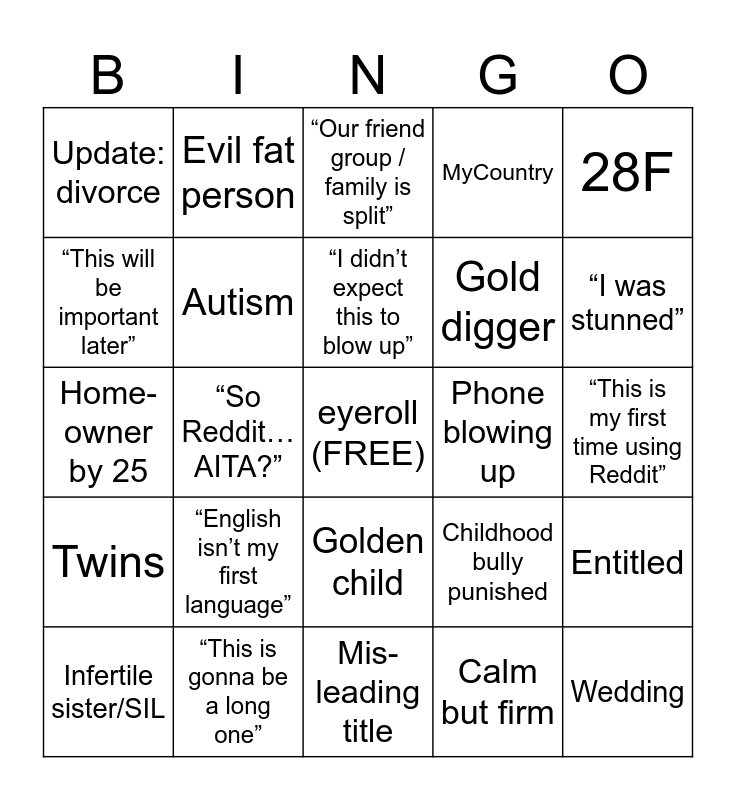 This bingo card has a free space and 24 words: “English isn’t my first language”, “This is gonna be a long one”, “I didn’t expect this to blow up”, Infertile sister/SIL, 28F, Update: divorce, “This will be important later”, Evil fat person, Phone blowing up, Golden child, Gold digger, Home-owner by 25, Childhood bully punished, Entitled, Autism, Calm but firm, “This is my first time using Reddit”, “Our friend group / family is split”, “I was stunned”, “So Reddit… AITA?”, Wedding, Twins, MyCountry and Mis-leading title.