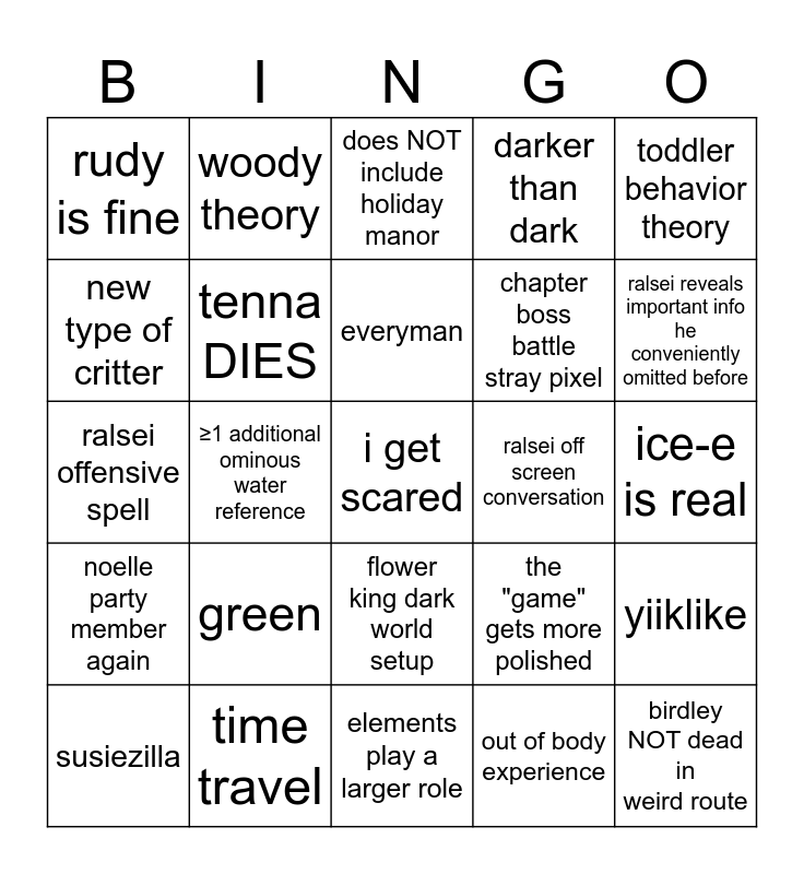 This bingo card has a free space and 24 words: green, time travel, everyman, susiezilla, toddler behavior theory, rudy is fine, new type of critter, woody theory, ralsei off screen conversation, flower king dark world setup, chapter boss battle stray pixel, ralsei offensive spell, the "game" gets more polished, yiiklike, tenna DIES, out of body experience, ice-e is real, does NOT include holiday manor, ralsei reveals important info he conveniently omitted before, ≥1 additional ominous water reference, birdley NOT dead in weird route, noelle party member again, darker than dark and elements play a larger role.