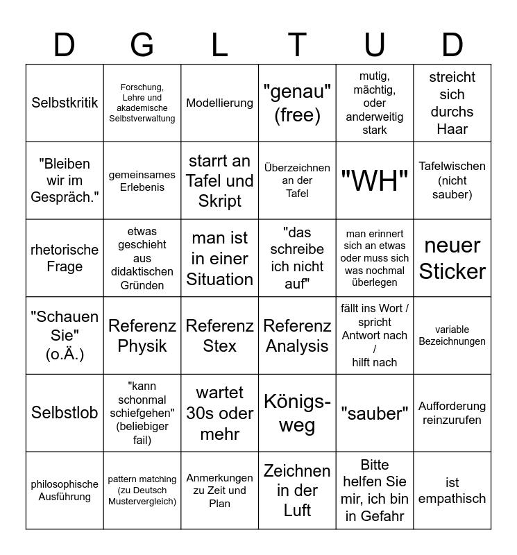 This bingo card has 36 words: Königs-weg, wartet 30s oder mehr, Zeichnen in der Luft, "Bleiben wir im Gespräch.", "Schauen Sie" (o.Ä.), "das schreibe ich nicht auf", gemeinsames Erlebenis, Anmerkungen zu Zeit und Plan, mutig, mächtig, oder anderweitig stark, "sauber", Tafelwischen (nicht sauber), "genau" (free), Aufforderung reinzurufen, etwas geschieht aus didaktischen Gründen, Überzeichnen an der Tafel, Selbstkritik, Selbstlob, man erinnert sich an etwas oder muss sich was nochmal überlegen, rhetorische Frage, Modellierung, man ist in einer Situation, Referenz Physik, Referenz Analysis, Referenz Stex, fällt ins Wort / spricht Antwort nach / hilft nach, Forschung, Lehre und akademische Selbstverwaltung, "WH", pattern matching (zu Deutsch Mustervergleich), starrt an Tafel und Skript, streicht sich durchs Haar, ist empathisch, philosophische Ausführung, variable Bezeichnungen, neuer Sticker, "kann schonmal schiefgehen" (beliebiger fail) and Bitte helfen Sie mir, ich bin in Gefahr.