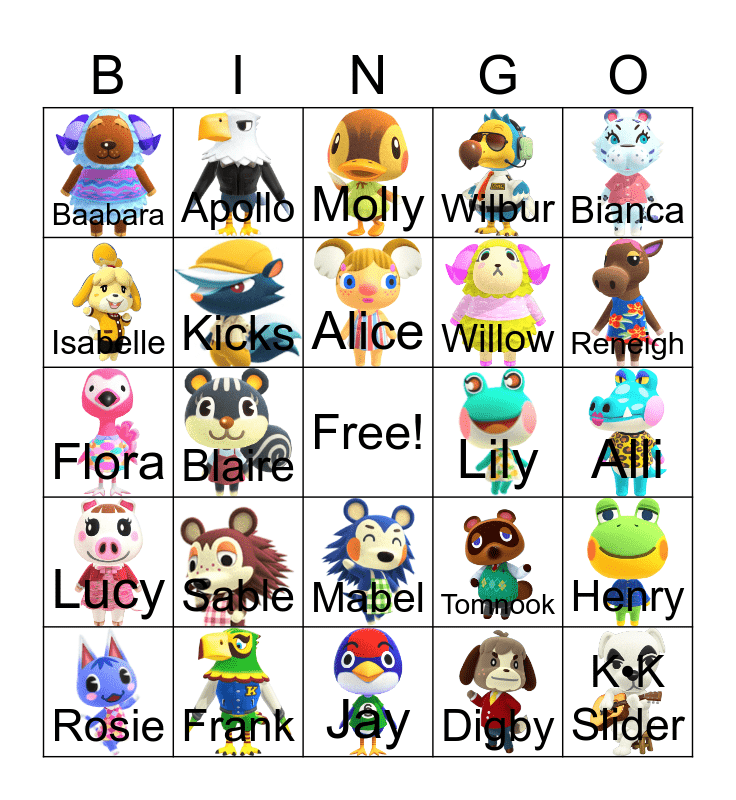 This bingo card has 24 images, a free space and 24 words: Sable, Frank, Alice, Rosie, Bianca, Baabara, Isabelle, Apollo, Lily, Mabel, Willow, Flora, Tomnook, Henry, Kicks, Digby, Alli, Molly, Reneigh, Blaire, K•K Slider, Lucy, Wilbur and Jay.