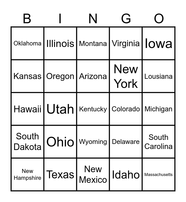 This bingo card has a free space and 24 words: Ohio, Texas, Arizona, New Hampshire, Iowa, Oklahoma, Kansas, Illinois, Colorado, Wyoming, New York, Hawaii, Delaware, South Carolina, Oregon, Idaho, Michigan, Montana, Lousiana, Utah, Massachusetts, South Dakota, Virginia and New Mexico.