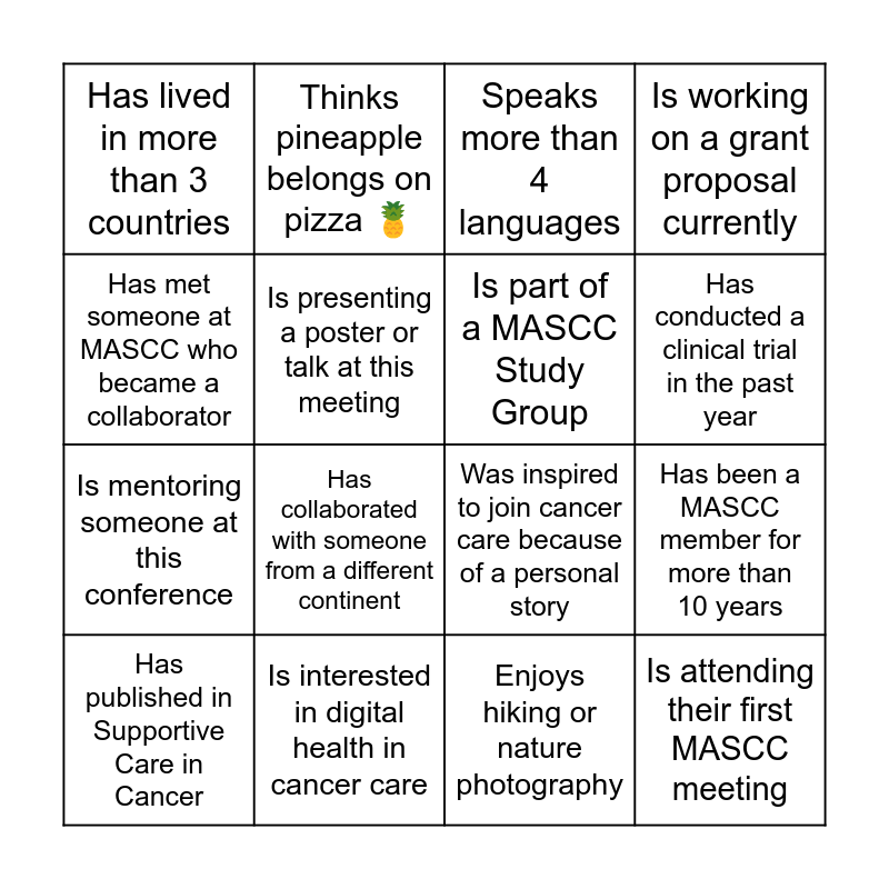 This bingo card has 16 words: Is interested in digital health in cancer care, Has been a MASCC member for more than 10 years, Speaks more than 4 languages, Has lived in more than 3 countries, Is mentoring someone at this conference, Thinks pineapple belongs on pizza 🍍, Was inspired to join cancer care because of a personal story, Enjoys hiking or nature photography, Has met someone at MASCC who became a collaborator, Is presenting a poster or talk at this meeting, Has published in Supportive Care in Cancer, Is working on a grant proposal currently, Has collaborated with someone from a different continent, Has conducted a clinical trial in the past year, Is part of a MASCC Study Group and Is attending their first MASCC meeting.