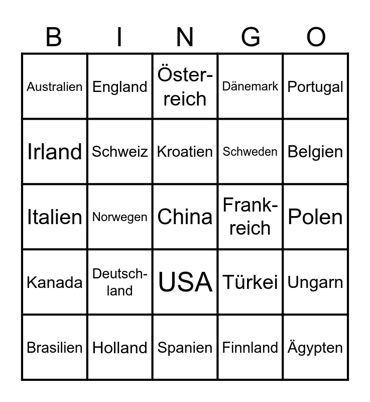 This bingo card has 25 words: Deutsch-land, Spanien, Kroatien, Brasilien, Portugal, Australien, Irland, England, Frank-reich, USA, Schweden, Italien, Türkei, Ungarn, Schweiz, Ägypten, Polen, Öster-reich, Belgien, Norwegen, China, Holland, Kanada, Dänemark and Finnland.