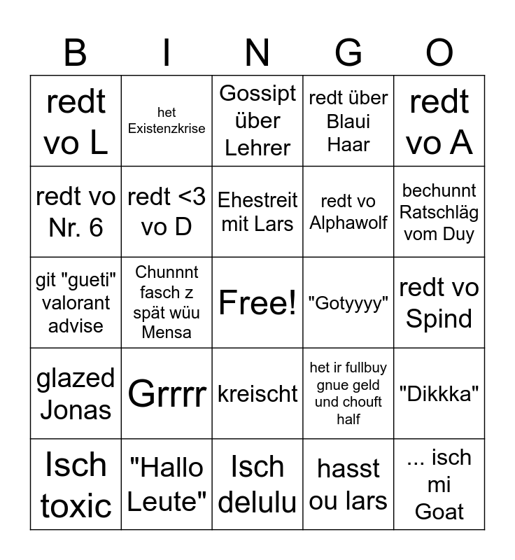 This bingo card has a free space and 24 words: Grrrr, "Hallo Leute", Ehestreit mit Lars, Isch toxic, redt vo A, redt vo L, redt vo Nr. 6, het Existenzkrise, "Gotyyyy", kreischt, redt vo Alphawolf, git "gueti" valorant advise, het ir fullbuy gnue geld und chouft half, "Dikkka", redt <3 vo D, hasst ou lars, redt vo Spind, Gossipt über Lehrer, bechunnt Ratschläg vom Duy, Chunnnt fasch z spät wüu Mensa, ... isch mi Goat, glazed Jonas, redt über Blaui Haar and Isch delulu.