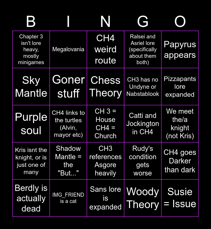 This bingo card has a free space and 24 words: Shadow Mantle = the "But...", IMG_FRIEND is a cat, Chess Theory, Berdly is actually dead, Papyrus appears, Chapter 3 isn't lore heavy, mostly minigames, Sky Mantle, Megalovania, Catti and Jockington in CH4, CH3 references Asgore heavily, CH3 has no Undyne or Nabstablook, Purple soul, Rudy's condition gets worse, CH4 goes Darker than dark, Goner stuff, Woody Theory, We meet the/a knight (not Kris), CH4 weird route, Pizzapants lore expanded, CH4 links to the turtles (Alvin, mayor etc), Susie = Issue, Kris isnt the knight, or is just one of many, Ralsei and Asriel lore (specifically about them both) and Sans lore is expanded.