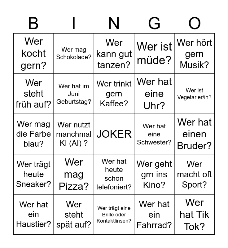 This bingo card has a free space and 24 words: Wer hat ein Haustier?, Wer mag Pizza?, Wer trinkt gern Kaffee?, Wer hat ein Fahrrad?, Wer hört gern Musik?, Wer kocht gern?, Wer mag Schokolade?, Wer kann gut tanzen?, Wer hat eine Schwester?, Wer hat einen Bruder?, Wer mag die Farbe blau?, Wer hat im Juni Geburtstag?, Wer geht grn ins Kino?, Wer macht oft Sport?, Wer steht früh auf?, Wer steht spät auf?, Wer trägt eine Brille oder Kontaktlinsen?, Wer ist müde?, Wer ist Vegetarier/in?, Wer trägt heute Sneaker?, Wer nutzt manchmal KI (AI) ?, Wer hat heute schon telefoniert?, Wer hat eine Uhr? and Wer hat Tik Tok?.