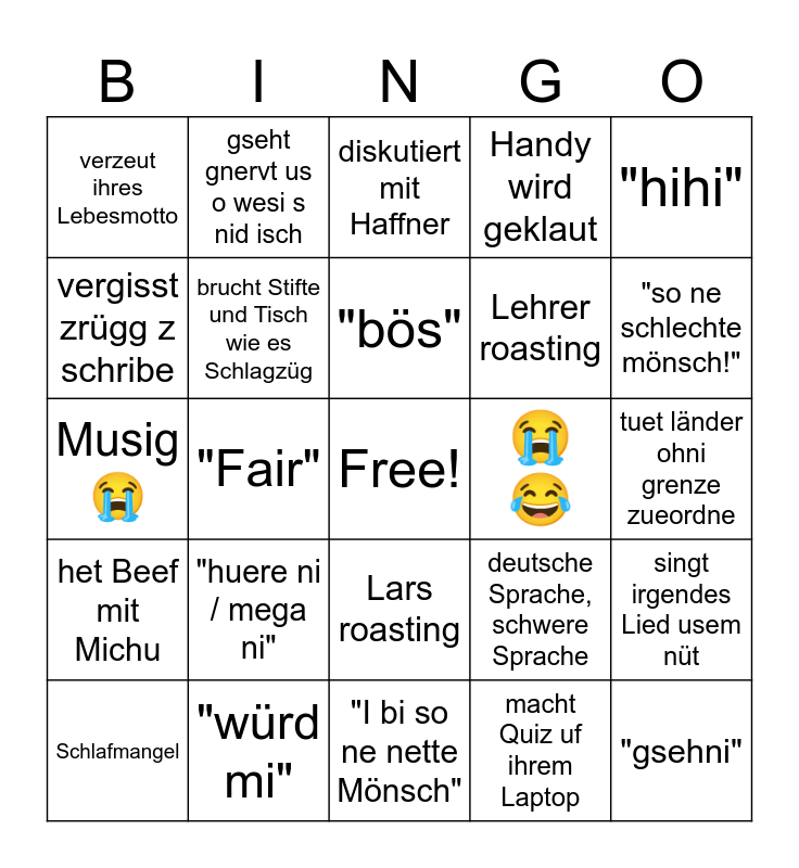 This bingo card has a free space and 24 words: "huere ni / mega ni", "würd mi", "bös", Schlafmangel, "hihi", verzeut ihres Lebesmotto, vergisst zrügg z schribe, gseht gnervt us o wesi s nid isch, 😭😂, Lars roasting, Lehrer roasting, Musig 😭, deutsche Sprache, schwere Sprache, singt irgendes Lied usem nüt, brucht Stifte und Tisch wie es Schlagzüg, macht Quiz uf ihrem Laptop, tuet länder ohni grenze zueordne, diskutiert mit Haffner, "so ne schlechte mönsch!", "Fair", "gsehni", het Beef mit Michu, Handy wird geklaut and "I bi so ne nette Mönsch".
