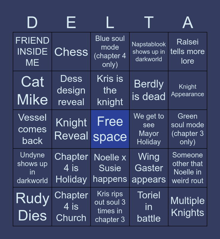 This bingo card has a free space and 24 words: Chapter 4 is Holiday, Chapter 4 is Church, Kris is the knight, Rudy Dies, Ralsei tells more lore, FRIEND INSIDE ME, Cat Mike, Chess, We get to see Mayor Holiday, Noelle x Susie happens, Berdly is dead, Vessel comes back, Wing Gaster appears, Someone other that Noelle in weird rout, Dess design reveal, Toriel in battle, Green soul mode (chapter 3 only), Blue soul mode (chapter 4 only), Knight Appearance, Knight Reveal, Multiple Knights, Undyne shows up in darkworld, Napstablook shows up in darkworld and Kris rips out soul 3 times in chapter 3.