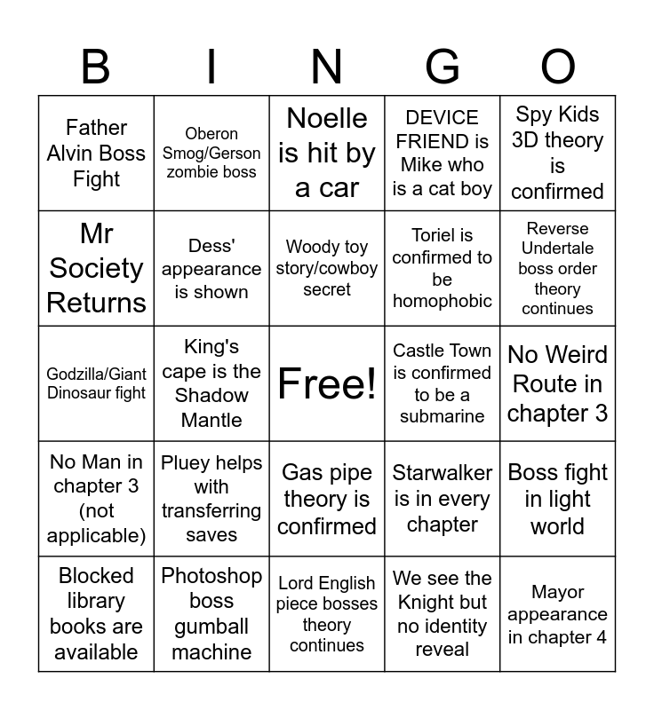 This bingo card has a free space and 24 words: Pluey helps with transferring saves, Photoshop boss gumball machine, Woody toy story/cowboy secret, Blocked library books are available, Spy Kids 3D theory is confirmed, Father Alvin Boss Fight, Mr Society Returns, Oberon Smog/Gerson zombie boss, Castle Town is confirmed to be a submarine, Gas pipe theory is confirmed, Toriel is confirmed to be homophobic, Godzilla/Giant Dinosaur fight, Starwalker is in every chapter, Boss fight in light world, Dess' appearance is shown, We see the Knight but no identity reveal, No Weird Route in chapter 3, Noelle is hit by a car, Reverse Undertale boss order theory continues, King's cape is the Shadow Mantle, Mayor appearance in chapter 4, No Man in chapter 3 (not applicable), DEVICE FRIEND is Mike who is a cat boy and Lord English piece bosses theory continues.