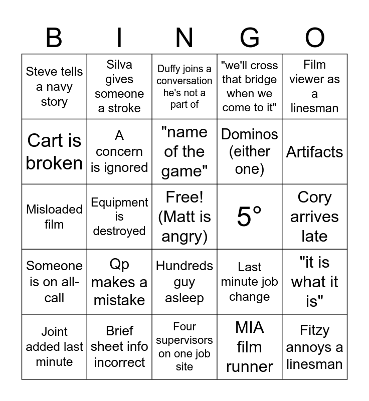 This bingo card has a free space and 24 words: Qp makes a mistake, Brief sheet info incorrect, "name of the game", Joint added last minute, Film viewer as a linesman, Steve tells a navy story, Cart is broken, Silva gives someone a stroke, 5°, Hundreds guy asleep, Dominos (either one), Misloaded film, Last minute job change, "it is what it is", A concern is ignored, MIA film runner, Cory arrives late, Duffy joins a conversation he's not a part of, Artifacts, Equipment is destroyed, Fitzy annoys a linesman, Someone is on all-call, "we'll cross that bridge when we come to it" and Four supervisors on one job site.