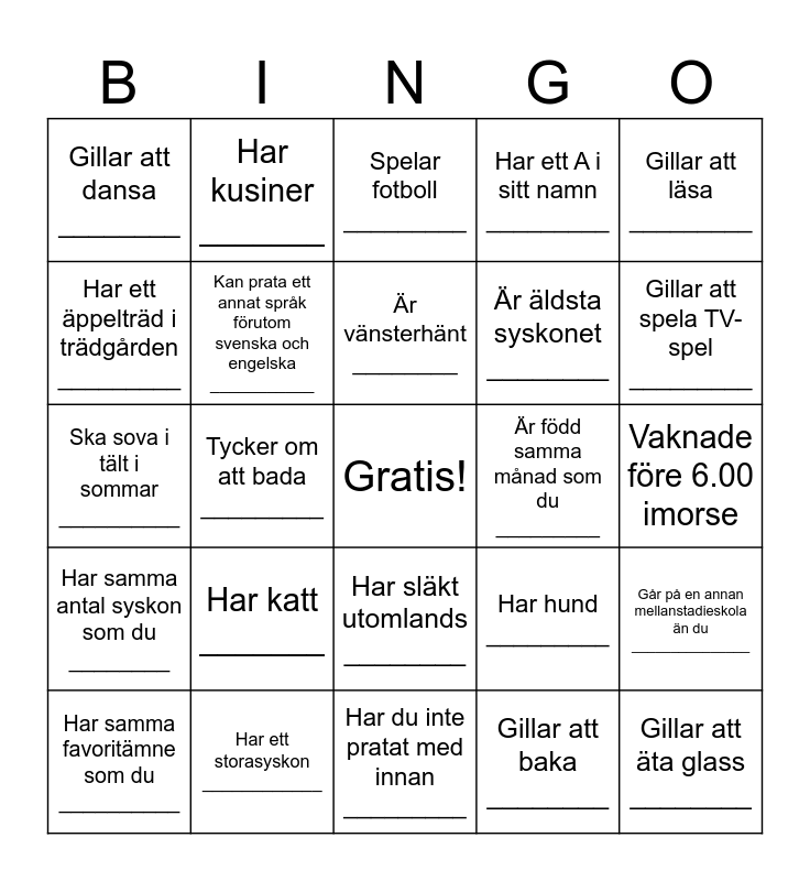 This bingo card has a free space and 24 words: Har katt _______, Har ett storasyskon ____________, Är vänsterhänt ________, Har samma favoritämne som du __________, Gillar att läsa _________, Gillar att dansa ________, Har ett äppelträd i trädgården _________, Har kusiner _______, Är född samma månad som du _________, Har släkt utomlands ________, Är äldsta syskonet ________, Ska sova i tält i sommar __________, Har hund _________, Går på en annan mellanstadieskola än du _______________, Kan prata ett annat språk förutom svenska och engelska ___________, Gillar att baka ________, Vaknade före 6.00 imorse, Spelar fotboll _________, Gillar att spela TV-spel _________, Tycker om att bada _________, Gillar att äta glass ________, Har samma antal syskon som du ________, Har ett A i sitt namn _________ and Har du inte pratat med innan _________.