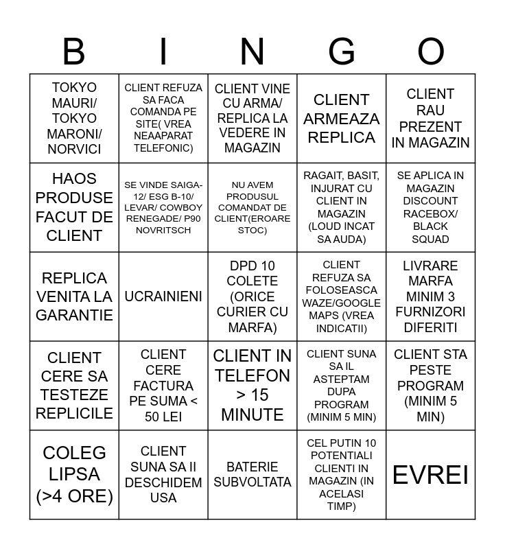 This bingo card has a free space and 24 words: CLIENT CERE FACTURA PE SUMA < 50 LEI, CLIENT SUNA SA II DESCHIDEM USA, NU AVEM PRODUSUL COMANDAT DE CLIENT(EROARE STOC), COLEG LIPSA (>4 ORE), CLIENT RAU PREZENT IN MAGAZIN, TOKYO MAURI/ TOKYO MARONI/ NORVICI, HAOS PRODUSE FACUT DE CLIENT, CLIENT REFUZA SA FACA COMANDA PE SITE( VREA NEAAPARAT TELEFONIC), CLIENT REFUZA SA FOLOSEASCA WAZE/GOOGLE MAPS (VREA INDICATII), CLIENT IN TELEFON > 15 MINUTE, RAGAIT, BASIT, INJURAT CU CLIENT IN MAGAZIN (LOUD INCAT SA AUDA), REPLICA VENITA LA GARANTIE, CLIENT SUNA SA IL ASTEPTAM DUPA PROGRAM (MINIM 5 MIN), CLIENT STA PESTE PROGRAM (MINIM 5 MIN), SE VINDE SAIGA-12/ ESG B-10/ LEVAR/ COWBOY RENEGADE/ P90 NOVRITSCH, CEL PUTIN 10 POTENTIALI CLIENTI IN MAGAZIN (IN ACELASI TIMP), LIVRARE MARFA MINIM 3 FURNIZORI DIFERITI, CLIENT VINE CU ARMA/ REPLICA LA VEDERE IN MAGAZIN, SE APLICA IN MAGAZIN DISCOUNT RACEBOX/ BLACK SQUAD, UCRAINIENI, EVREI, CLIENT CERE SA TESTEZE REPLICILE, CLIENT ARMEAZA REPLICA and BATERIE SUBVOLTATA.