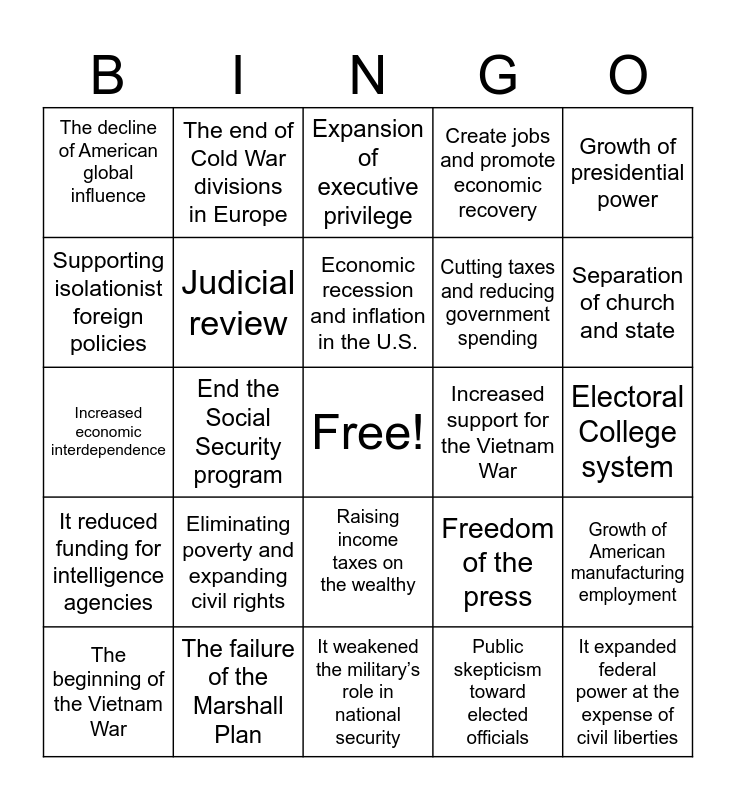 This bingo card has a free space and 24 words: Eliminating poverty and expanding civil rights, The failure of the Marshall Plan, Economic recession and inflation in the U.S., The beginning of the Vietnam War, Growth of presidential power, The decline of American global influence, Supporting isolationist foreign policies, The end of Cold War divisions in Europe, Increased support for the Vietnam War, Raising income taxes on the wealthy, Cutting taxes and reducing government spending, Increased economic interdependence, Freedom of the press, Growth of American manufacturing employment, Judicial review, Public skepticism toward elected officials, Electoral College system, Expansion of executive privilege, Separation of church and state, End the Social Security program, It expanded federal power at the expense of civil liberties, It reduced funding for intelligence agencies, Create jobs and promote economic recovery and It weakened the military’s role in national security.