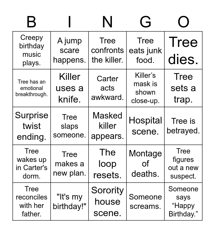 This bingo card has 25 words: Tree wakes up in Carter's dorm., "It's my birthday!", Masked killer appears., Someone screams., Tree dies., Creepy birthday music plays., A jump scare happens., Tree confronts the killer., Hospital scene., Tree figures out a new suspect., Tree has an emotional breakthrough., Killer uses a knife., Sorority house scene., Montage of deaths., Tree sets a trap., Tree reconciles with her father., Tree slaps someone., Carter acts awkward., Killer’s mask is shown close-up., Tree is betrayed., Surprise twist ending., Tree makes a new plan., The loop resets., Tree eats junk food. and Someone says “Happy Birthday.”.