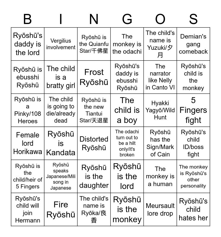 This bingo card has 36 words: Ryōshū is the lord, Ryōshū is the daughter, Ryōshū is the monkey, Ryōshū is ebusshi Ryōshū, Female lord Horikawa, The child is a boy, The child is a bratty girl, The child's name is Ryōka/良香, The child's name is Yuzuki/夕月, The monkey is a human, Ryōshū's child is the monkey, The monkey is the odachi, The monkey is Ryōshū's other personality, The child is going to die/already dead, Ryōshū's daddy is ebusshi Ryōshū, Ryōshū's daddy is the lord, Ryōshū is the child/heir of 5 Fingers, Hyakki Yagyō/Wild Hunt, Ryōshū is a Pinky/108 Heroes, Ryōshū is the Quianfu Star/千佛星, Ryōshū is the new Tiantui Star/天退星, Ryōshū is Kandata, The odachi turn out to be a hilt only/it's broken, Distorted Ryōshū, Ryōshū has the Sign/Mark of Cain, Vergilius involvement, The narrator like Nelly in Canto VI, Fire Ryōshū, Frost Ryōshū, Demian's gang comeback, Ryōshū's child hates her, Ryōshū's child will join Hermann, Ryōshū's child ID/boss fight, 5 Fingers fight, Ryōshū speaks Japanese/Mili song in Japanese and Meursault lore drop.