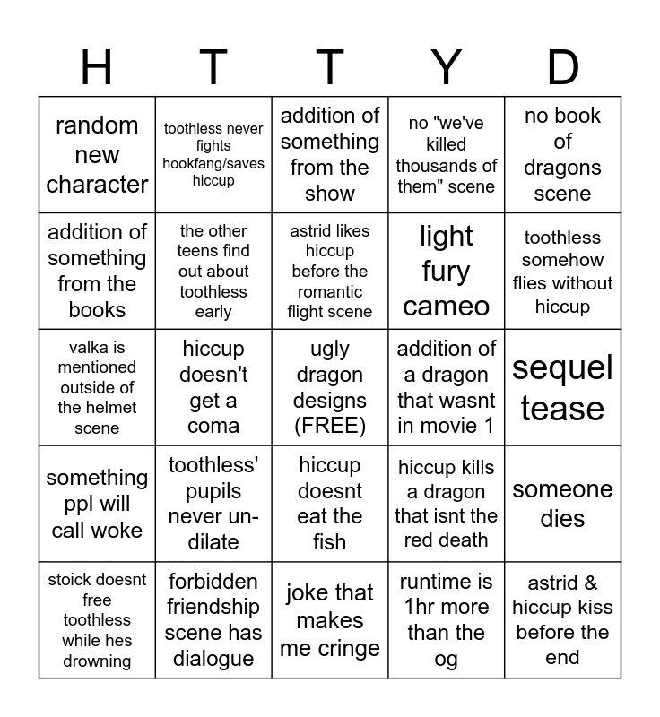 This bingo card has a free space and 24 words: toothless' pupils never un-dilate, forbidden friendship scene has dialogue, astrid likes hiccup before the romantic flight scene, stoick doesnt free toothless while hes drowning, no book of dragons scene, random new character, addition of something from the books, toothless never fights hookfang/saves hiccup, addition of a dragon that wasnt in movie 1, hiccup doesnt eat the fish, light fury cameo, valka is mentioned outside of the helmet scene, hiccup kills a dragon that isnt the red death, someone dies, the other teens find out about toothless early, runtime is 1hr more than the og, sequel tease, addition of something from the show, toothless somehow flies without hiccup, hiccup doesn't get a coma, astrid & hiccup kiss before the end, something ppl will call woke, no "we've killed thousands of them" scene and joke that makes me cringe.