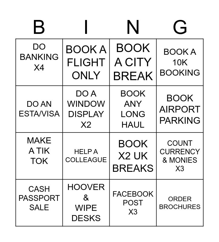 This bingo card has 16 words: HOOVER & WIPE DESKS, COUNT CURRENCY & MONIES X3, BOOK A CITY BREAK, DO BANKING X4, MAKE A TIK TOK, BOOK A FLIGHT ONLY, BOOK X2 UK BREAKS, FACEBOOK POST X3, DO AN ESTA/VISA, DO A WINDOW DISPLAY X2, CASH PASSPORT SALE, BOOK A 10K BOOKING, HELP A COLLEAGUE, BOOK AIRPORT PARKING, BOOK ANY LONG HAUL and ORDER BROCHURES.