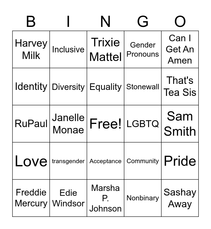 This bingo card has a free space and 24 words: transgender, Edie Windsor, Equality, Freddie Mercury, Can I Get An Amen, Harvey Milk, Identity, Inclusive, LGBTQ, Acceptance, Stonewall, RuPaul, Community, Pride, Diversity, Nonbinary, Sam Smith, Trixie Mattel, That's Tea Sis, Janelle Monae, Sashay Away, Love, Gender Pronouns and Marsha P. Johnson.