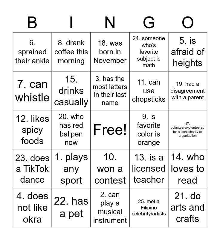 This bingo card has a free space and 25 words: 1. plays any sport, 2. can play a musical instrument, 3. has the most letters in their last name, 4. does not like okra, 5. is afraid of heights, 6. sprained their ankle, 7. can whistle, 8. drank coffee this morning, 9. is favorite color is orange, 10. won a contest, 11. can use chopsticks, 12. likes spicy foods, 13. is a licensed teacher, 14. who loves to read, 15. drinks casually, 16. loves to cook, 17. volunteers/volunteered for a local charity or organization, 18. was born in November, 19. had a disagreement with a parent, 20. who has red ballpen now, 21. do arts and crafts, 22. has a pet, 23. does a TikTok dance, 24. someone who’s favorite subject is math and 25. met a Filipino celebrity/artists.
