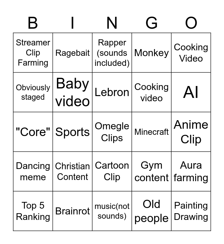 This bingo card has a free space and 24 words: Christian Content, Brainrot, Lebron, Top 5 Ranking, Cooking Video, Streamer Clip Farming, Obviously staged, Ragebait, Minecraft, Cartoon Clip, Cooking video, "Core", Gym content, Aura farming, Baby video, Old people, Anime Clip, Rapper (sounds included), AI, Sports, Painting Drawing, Dancing meme, Monkey and music(not sounds).