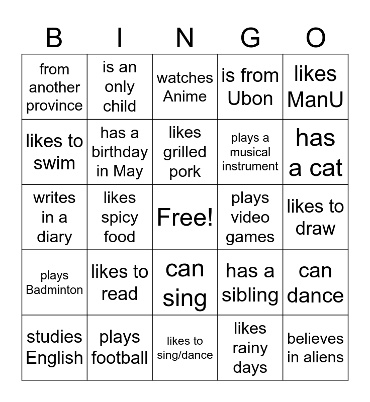 This bingo card has a free space and 24 words: likes to read, plays football, likes grilled pork, studies English, likes ManU, from another province, likes to swim, is an only child, plays video games, can sing, plays a musical instrument, writes in a diary, has a sibling, can dance, has a birthday in May, likes rainy days, likes to draw, watches Anime, has a cat, likes spicy food, believes in aliens, plays Badminton, is from Ubon and likes to sing/dance.