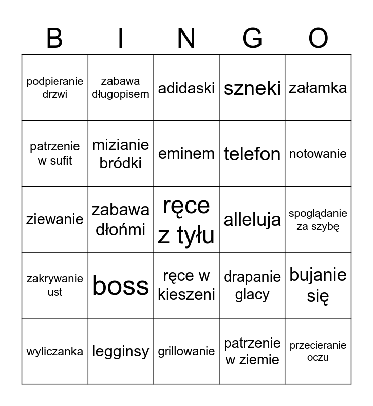 This bingo card has a free space and 24 words: boss, legginsy, eminem, wyliczanka, załamka, podpieranie drzwi, patrzenie w sufit, zabawa długopisem, alleluja, ręce w kieszeni, telefon, ziewanie, drapanie glacy, bujanie się, mizianie bródki, patrzenie w ziemie, spoglądanie za szybę, adidaski, notowanie, zabawa dłońmi, przecieranie oczu, zakrywanie ust, szneki and grillowanie.