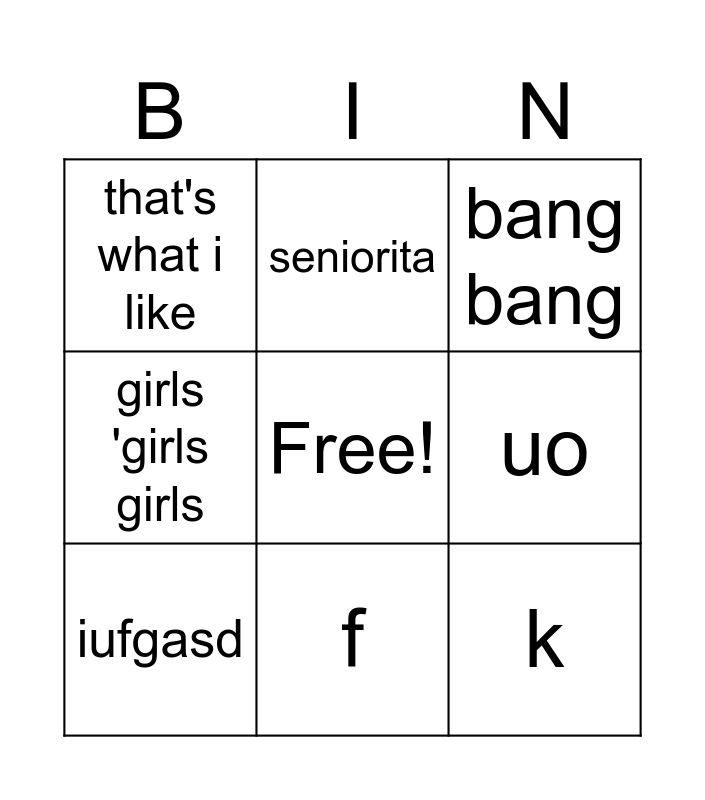 This bingo card has a free space and 18 words: Hair, swish swish, bang bang, that's what i like, star ship, girls 'girls girls, woman like me, seniorita, f, g, hj, k, g, uo, iufgasd, errgre, yrtf and hthjk.