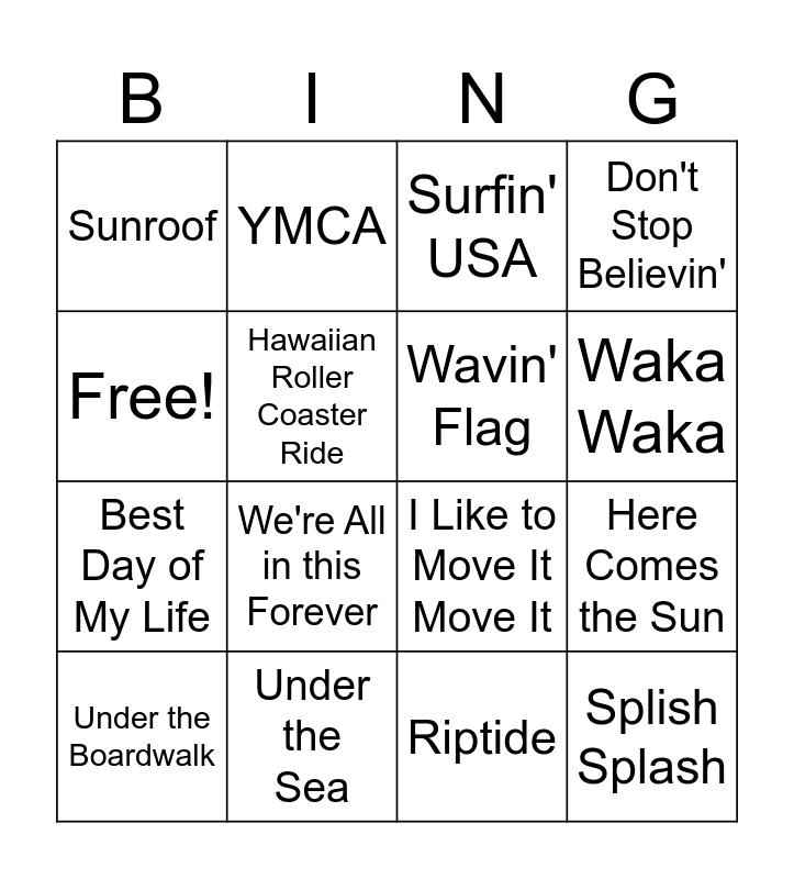 This bingo card has 16 words: Under the Sea, Here Comes the Sun, Surfin' USA, Sunroof, Best Day of My Life, YMCA, I Like to Move It Move It, Riptide, Free!, Hawaiian Roller Coaster Ride, Under the Boardwalk, Don't Stop Believin', We're All in this Forever, Waka Waka, Wavin' Flag and Splish Splash.