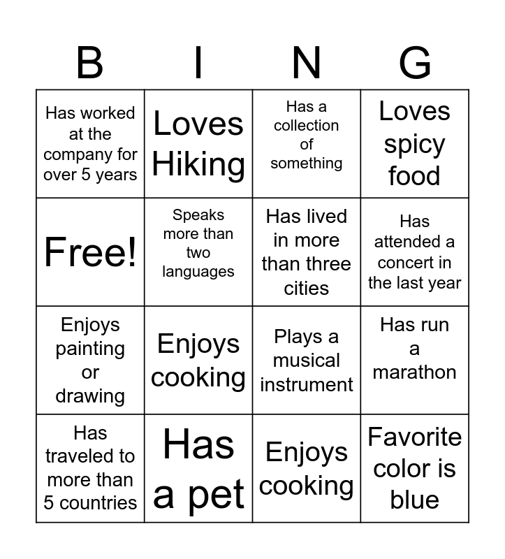 This bingo card has 16 words: Has a pet, Has run a marathon, Has a collection of something, Has worked at the company for over 5 years, Enjoys painting or drawing, Loves Hiking, Plays a musical instrument, Enjoys cooking, Free!, Speaks more than two languages, Has traveled to more than 5 countries, Loves spicy food, Enjoys cooking, Has attended a concert in the last year, Has lived in more than three cities and Favorite color is blue.