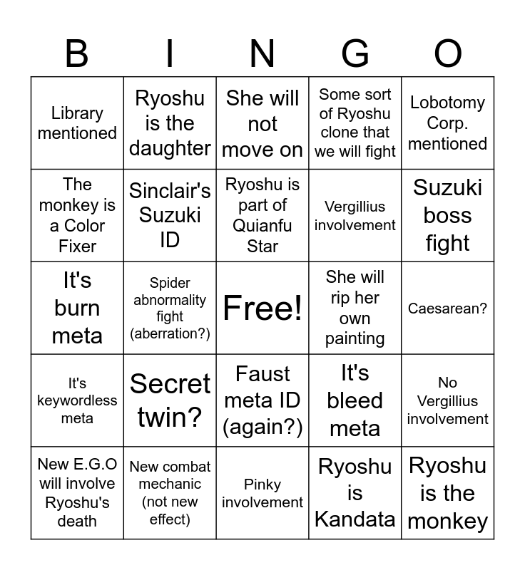 This bingo card has a free space and 24 words: Secret twin?, New combat mechanic (not new effect), Ryoshu is part of Quianfu Star, New E.G.O will involve Ryoshu's death, Lobotomy Corp. mentioned, Library mentioned, The monkey is a Color Fixer, Ryoshu is the daughter, She will rip her own painting, Faust meta ID (again?), Vergillius involvement, It's burn meta, It's bleed meta, No Vergillius involvement, Sinclair's Suzuki ID, Ryoshu is Kandata, Caesarean?, She will not move on, Suzuki boss fight, Spider abnormality fight (aberration?), Ryoshu is the monkey, It's keywordless meta, Some sort of Ryoshu clone that we will fight and Pinky involvement.