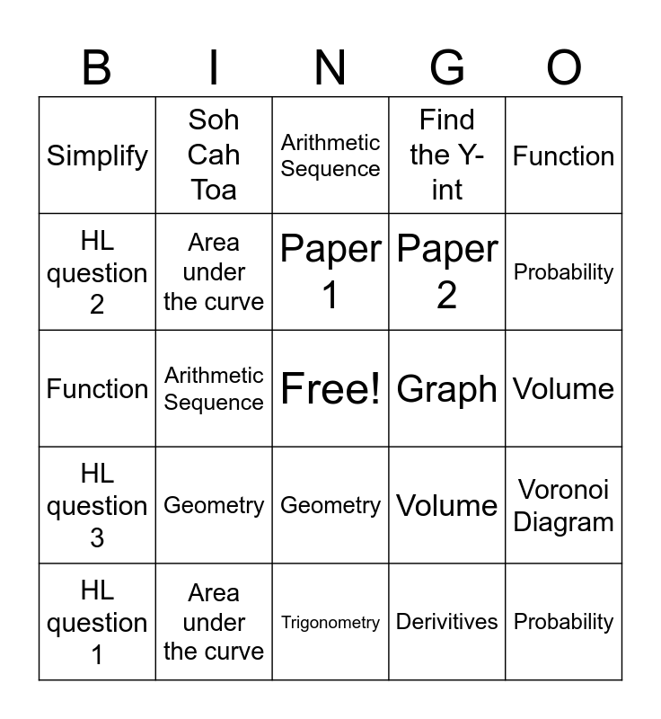 This bingo card has a free space and 49 words: Find X, Probability, HL question 1, Trigonometry, Geometry, HL question 3, Soh Cah Toa, Quadratics, HL question 2, Angle of depression, Area under the curve, Find the Y-int, Voronoi Diagram, Volume, Calculus, Fractions, Paper 1, Graph, Logarithms, Function, Arithmetic Sequence, Derivitives, Simplify, Paper 2, Find X, Probability, HL question 1, Trigonometry, Geometry, HL question 3, Soh Cah Toa, Quadratics, HL question 2, Volume, Area under the curve, Find the Y-int, Free!, Voronoi Diagram, Volume, Calculus, Fractions, Paper 1, Graph, Logarithms, Function, Arithmetic Sequence, Derivitives, Simplify and Paper 2.
