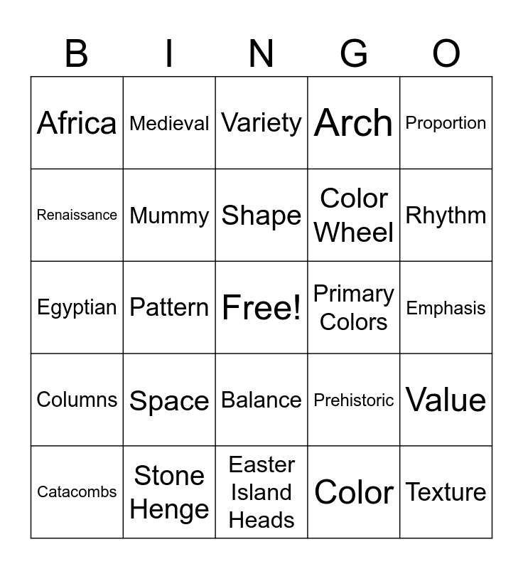 This bingo card has a free space and 42 words: Line, Shape, Form, Space, Color, Value, Texture, Unity, Variety, Balance, Emphasis, Rhythm, Pattern, Proportion, Stained Glass, Prehistoric, Greek, Egyptian, Roman, Medieval, Renaissance, Mosaic, Sphinx, Africa, The Acropolis, Canopic Jars, Color Wheel, Megalith, Papyrus, Mural, Easter Island Heads, Columns, Mummy, Easter Island Heads, Mona Lisa, Catacombs, Stone Henge, Primary Colors, Sarcophagus, Illuminated Manuscript, Arch and Great Pyramids of Giza.