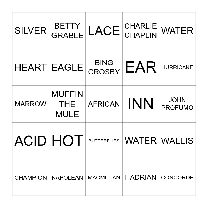 This bingo card has a free space and 29 words: CHAMPION, BLACK BEAUTY, MUFFIN THE MULE, RUPERT, SILVER, LACE, EAGLE, HOT, INN, NAPOLEAN, JOHN PROFUMO, CONCORDE, MACMILLAN, HADRIAN, HURRICANE, HEMP, BUTTERFLIES, ACID, WATER, MARROW, WATER, FINGERTIP, EAR, HEART, CHARLIE CHAPLIN, BETTY GRABLE, WALLIS, BING CROSBY and CHARLES DARWIN.