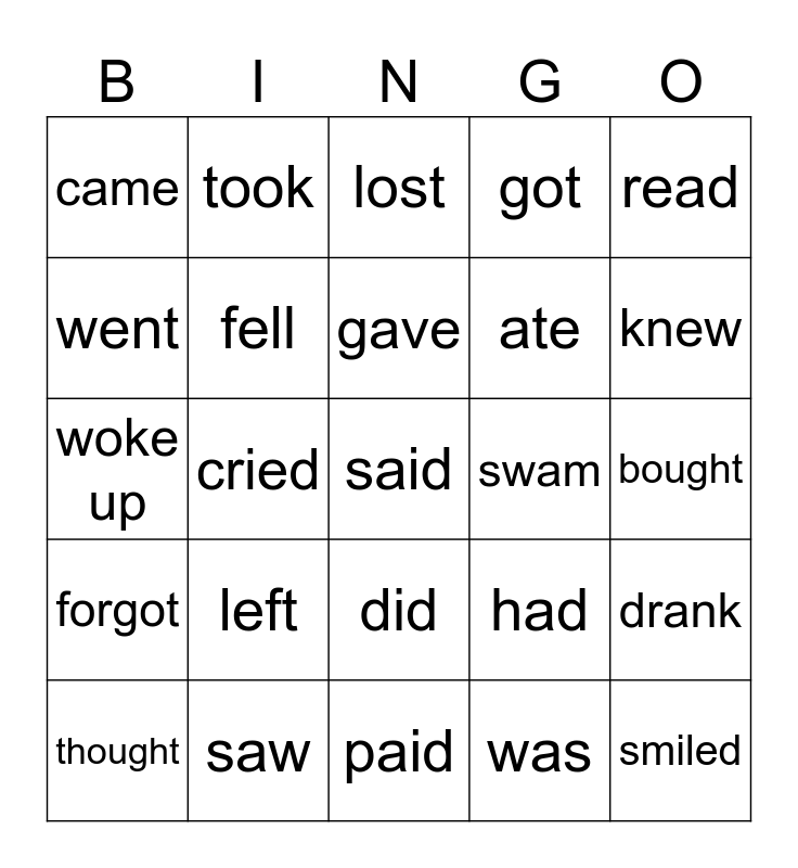This bingo card has 26 words: did, was, gave, saw, read, came, went, took, bought, had, ate, woke up, drank, thought, cried, tried, got, forgot, lost, said, knew, paid, swam, left, fell and smiled.
