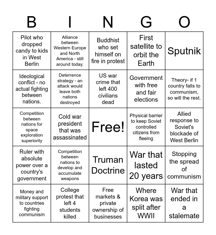 This bingo card has a free space and 27 words: War that lasted 20 years, Plan offered Money to countries to rebuild after WWII, Government with free and fair elections, Free markets & private ownership of businesses, Ideological conflict - no actual fighting between nations., Buddhist who set himself on fire in protest, Alliance between Western Europe and North America - still around today., Ruler with absolute power over a country's government, Physical barrier to keep Soviet controlled citizens from fleeing, Stopping the spread of communism, Competition between nations for space exploration superiority, First satellite to orbit the Earth, Money and military support to countries fighting communism, College protest that left 4 students killed, Theory- if 1 country falls to communism, so will the rest., Imaginary line that divided Europe during the Cold War, Deterrence strategy - an attack would leave both nations destroyed, US war crime that left 400 civilians dead, Competition between nations to develop and accumulate weapons, Pilot who dropped candy to kids in West Berlin, Allied response to Soviet's blockade of West Berlin, Where Korea was split after WWII, Cold war president that was assassinated, War that ended in a stalemate, Truman Doctrine, Sputnik and communism.