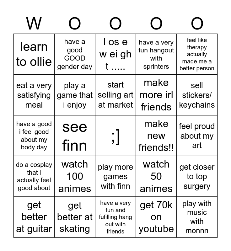 This bingo card has a free space and 24 words: watch 100 animes, get better at skating, start selling art at market, get better at guitar, feel like therapy actually made me a better person, learn to ollie, eat a very satisfying meal, have a good GOOD gender day, make new friends!!, play more games with finn, make more irl friends, have a good i feel good about my body day, watch 50 animes, get closer to top surgery, play a game that i enjoy, get 70k on youtube, feel proud about my art, l os e w ei gh t ....., sell stickers/ keychains, see finn, play with music with monnn, do a cosplay that i actually feel good about, have a very fun hangout with sprinters and have a very fun and fufilling hang out with friends.