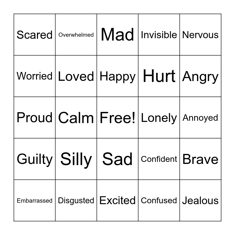 This bingo card has a free space and 25 words: Silly, Excited, Happy, Embarrassed, Nervous, Scared, Worried, Overwhelmed, Lonely, Sad, Hurt, Proud, Confident, Brave, Loved, Special, Annoyed, Mad, Angry, Calm, Jealous, Disgusted, Guilty, Invisible and Confused.