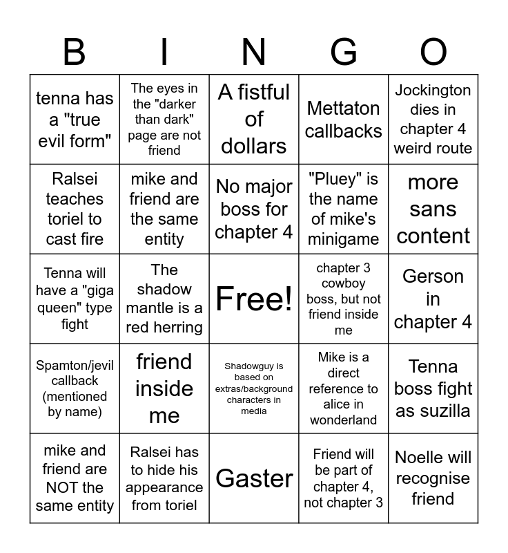 This bingo card has a free space and 24 words: friend inside me, Ralsei has to hide his appearance from toriel, No major boss for chapter 4, mike and friend are NOT the same entity, Jockington dies in chapter 4 weird route, tenna has a "true evil form", Ralsei teaches toriel to cast fire, The eyes in the "darker than dark" page are not friend, chapter 3 cowboy boss, but not friend inside me, Shadowguy is based on extras/background characters in media, "Pluey" is the name of mike's minigame, Tenna will have a "giga queen" type fight, Mike is a direct reference to alice in wonderland, Tenna boss fight as suzilla, mike and friend are the same entity, Friend will be part of chapter 4, not chapter 3, Gerson in chapter 4, A fistful of dollars, more sans content, The shadow mantle is a red herring, Noelle will recognise friend, Spamton/jevil callback (mentioned by name), Mettaton callbacks and Gaster.