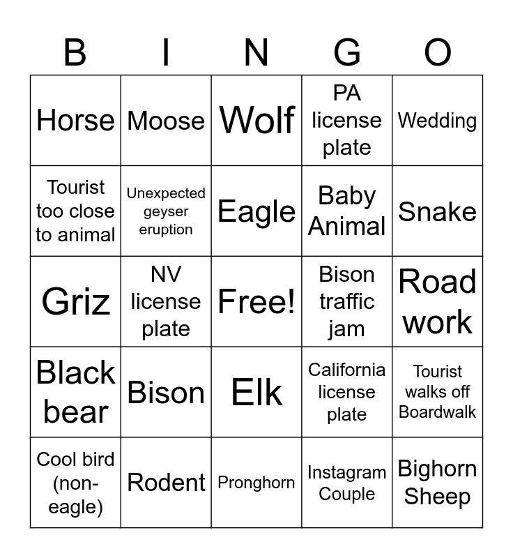 This bingo card has a free space and 24 words: Bison, Rodent, Eagle, Cool bird (non-eagle), Wedding, Horse, Tourist too close to animal, Moose, Bison traffic jam, Elk, Baby Animal, Griz, California license plate, Tourist walks off Boardwalk, Unexpected geyser eruption, Instagram Couple, Road work, Wolf, Snake, NV license plate, Bighorn Sheep, Black bear, PA license plate and Pronghorn.