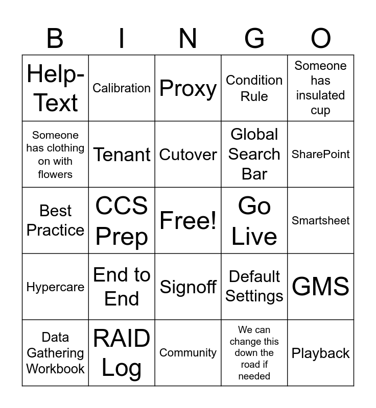 This bingo card has a free space and 29 words: Data Gathering Workbook, Config Workbook, CCS Prep, Customer Confirmation Sessions, Help-Text, Proxy, Tenant, End to End, Go Live, RAID Log, Smartsheet, Playback, Community, We can change this down the road if needed, SharePoint, Drag and Drop, Signoff, Hypercare, Someone has insulated cup, Best Practice, Default Settings, Custom Notification, Global Search Bar, Someone has clothing on with flowers, Condition Rule, Calibration, GMS, Cutover and Acquisition.