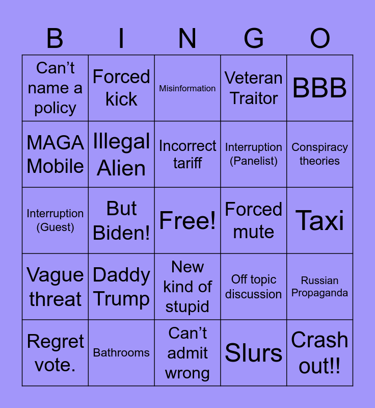 This bingo card has a free space and 24 words: Daddy Trump, Bathrooms, Incorrect tariff, Regret vote., BBB, Canβt name a policy, MAGA Mobile, Forced kick, Forced mute, New kind of stupid, Interruption (Panelist), Interruption (Guest), Off topic discussion, Russian Propaganda, Illegal Alien, Slurs, Taxi, Misinformation, Conspiracy theories, But Biden!, Crash out!!, Vague threat, Veteran Traitor and Canβt admit wrong.
