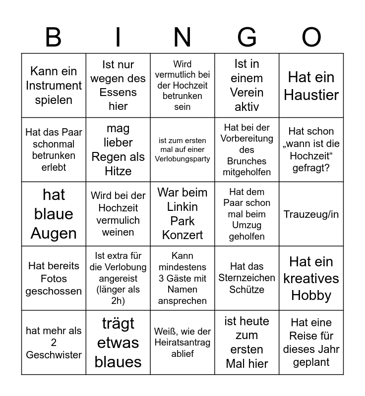 This bingo card has a free space and 24 words: Ist extra für die Verlobung angereist (länger als 2h), trägt etwas blaues, ist zum ersten mal auf einer Verlobungsparty, hat mehr als 2 Geschwister, Hat ein Haustier, Kann ein Instrument spielen, Hat das Paar schonmal betrunken erlebt, Ist nur wegen des Essens hier, Hat dem Paar schon mal beim Umzug geholfen, Kann mindestens 3 Gäste mit Namen ansprechen, Hat bei der Vorbereitung des Brunches mitgeholfen, hat blaue Augen, Hat das Sternzeichen Schütze, Hat ein kreatives Hobby, mag lieber Regen als Hitze, ist heute zum ersten Mal hier, Trauzeug/in, Wird vermutlich bei der Hochzeit betrunken sein, Hat schon „wann ist die Hochzeit“ gefragt?, Wird bei der Hochzeit vermulich weinen, Hat eine Reise für dieses Jahr geplant, Hat bereits Fotos geschossen, Ist in einem Verein aktiv and Weiß, wie der Heiratsantrag ablief.