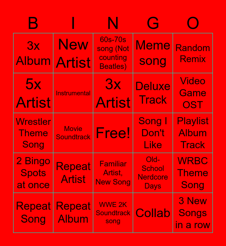 This bingo card has a free space and 24 words: Repeat Artist, Repeat Album, 3x Artist, Repeat Song, Random Remix, 3x Album, 5x Artist, New Artist, Song I Don't Like, Familiar Artist, New Song, Deluxe Track, Wrestler Theme Song, Old-School Nerdcore Days, WRBC Theme Song, Instrumental, Collab, Playlist Album Track, 60s-70s song (Not counting Beatles), Video Game OST, Movie Soundtrack, 3 New Songs in a row, 2 Bingo Spots at once, Meme song and WWE 2K Soundtrack song.