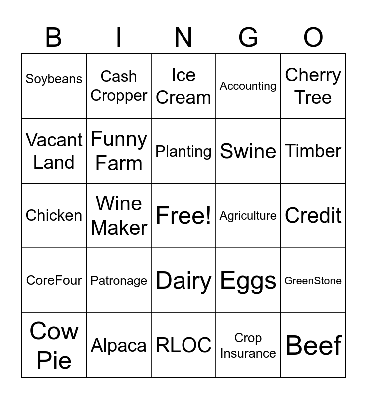 This bingo card has a free space and 24 words: Patronage, Alpaca, Planting, Cow Pie, Cherry Tree, Soybeans, Vacant Land, Cash Cropper, Agriculture, Dairy, Swine, Chicken, Eggs, GreenStone, Funny Farm, Crop Insurance, Credit, Ice Cream, Timber, Wine Maker, Beef, CoreFour, Accounting and RLOC.