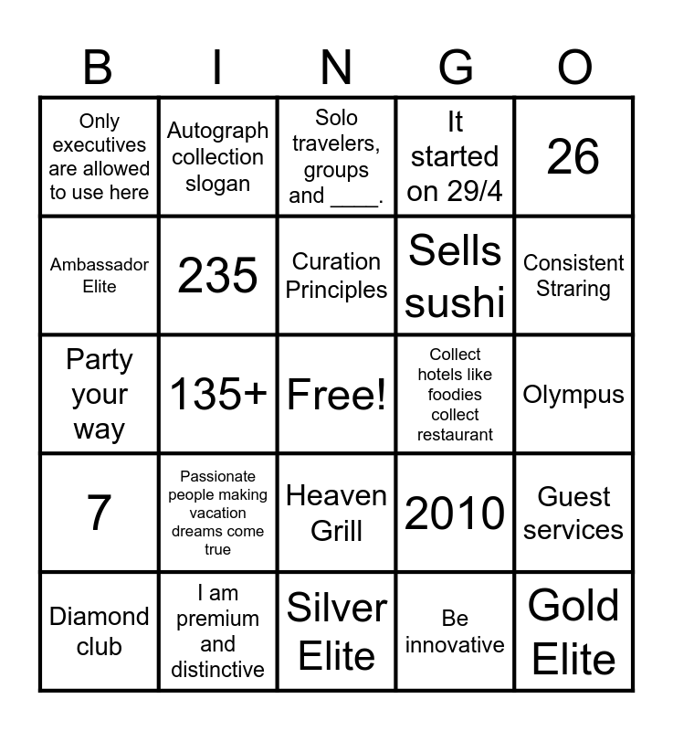 This bingo card has a free space and 24 words: Diamond club, Passionate people making vacation dreams come true, Curation Principles, Be innovative, 26, Only executives are allowed to use here, Autograph collection slogan, Solo travelers, groups and ____., Collect hotels like foodies collect restaurant, Olympus, Party your way, 235, 2010, Guest services, Ambassador Elite, I am premium and distinctive, Silver Elite, It started on 29/4, Consistent Straring, 7, 135+, Heaven Grill, Sells sushi and Gold Elite.