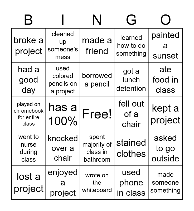 This bingo card has a free space and 29 words: lost a project, Has a missing assignment, has a 100%, received a red pass, broke a project, made a friend, used colored pencils on a project, knocked over a chair, fell out of a chair, enjoyed a project, kept a project, made someone something, wrote on the whiteboard, used phone in class, ate food in class, made a mess, spent majority of class in bathroom, went to nurse during class, painted a sunset, played on chromebook for entire class, stained clothes, threw something at trash can and made it, got a lunch detention, had a good day, learned how to do something, cleaned up someone's mess, asked to go outside, borrowed a pencil and watched another class outside.