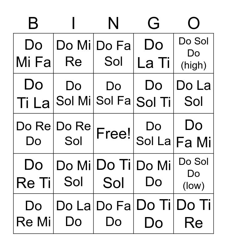 This bingo card has a free space and 24 words: Do Mi Sol, Do La Do, Do Sol Fa, Do Re Mi, Do Sol Do (high), Do Mi Fa, Do Ti La, Do Mi Re, Do Sol La, Do Ti Sol, Do Sol Ti, Do Re Do, Do Mi Do, Do Sol Do (low), Do Sol Mi, Do Ti Do, Do Fa Mi, Do Fa Sol, Do La Sol, Do Re Sol, Do Ti Re, Do Re Ti, Do La Ti and Do Fa Do.
