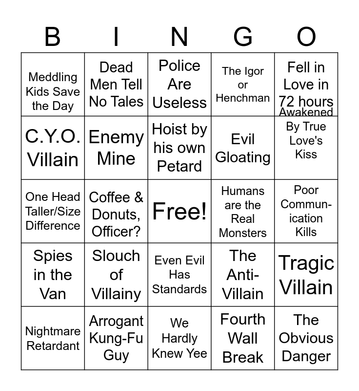 This bingo card has a free space and 49 words: Nightmare Fuel, The Obvious Danger, Conveyor Belt of Doom, We Hardly Knew Yee, Slouch of Villainy, Chekov's Gun, Dead Men Tell No Tales, Yikes in 60 Seconds, C.Y.O. Villain, Complete Monster, Enemy Mine, The Igor or Henchman, Tragic Villain, The Anti-Villain, Utopia justifies Means, Professor Guinea pig, Hoist by his own Petard, Humans are the Real Monsters, Smoking is Glamorous, Fell in Love in 72 hours, Coffee & Donuts, Officer?, Fourth Wall Break, Meddling Kids Save the Day, Evil Gloating, Rescue Romance!, Awakened By True Love's Kiss, Nightmare Retardant, KITTY!!!, Even Evil Has Standards, Spies in the Van, Cowboy Cop, Cassandra Truth, Death Seeker, Let's Split up, Gang!, Arrogant Kung-Fu Guy, Nothing but Skin and Bones, The Cake is a Lie, The Friend Nobody Likes, Poor Commun-ication Kills, Enemies to Lovers, Product Placement!, Just Two Dudes Bein' Guys, Flashback!, Doggo!, One Head Taller/Size Difference, Police Are Useless, HO YAY!!, Perp Sweating and Sealed Evil in a Can.