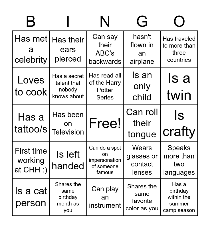 This bingo card has a free space and 24 words: Is left handed, Shares the same birthday month as you, Has read all of the Harry Potter Series, Is a cat person, Has traveled to more than three countries, Has met a celebrity, Loves to cook, Has their ears pierced, Can roll their tongue, Can do a spot on impersonation of someone famous, Is an only child, Has a tattoo/s, Wears glasses or contact lenses, Speaks more than two languages, Has a secret talent that nobody knows about, Shares the same favorite color as you, Is crafty, Can say their ABC's backwards, Is a twin, Has been on Television, Has a birthday within the summer camp season, First time working at CHH :), hasn't flown in an airplane and Can play an instrument.